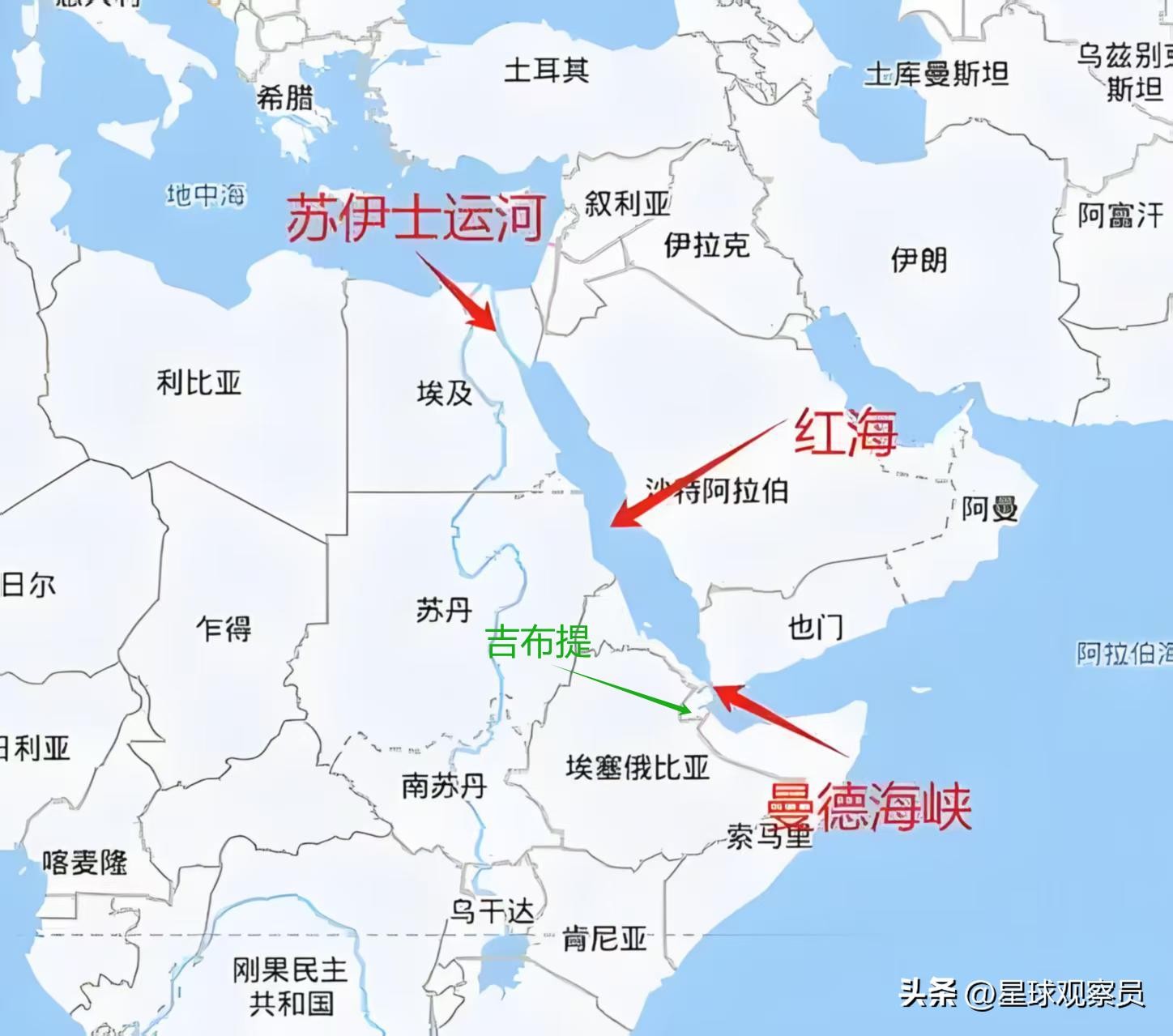 苏伊士运河-红海-曼德海峡与吉布提的位置分布