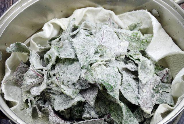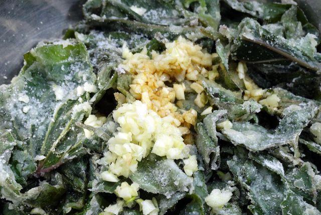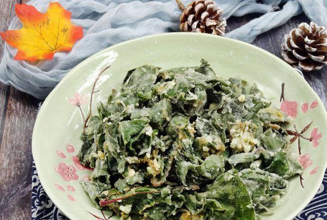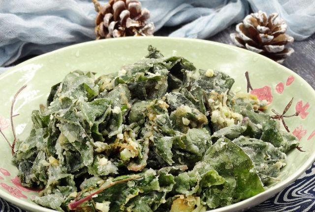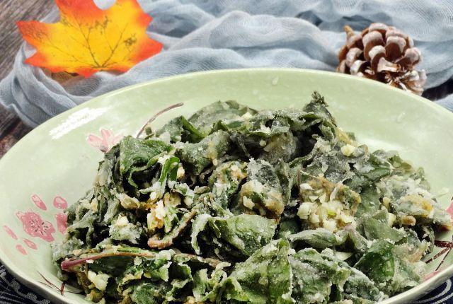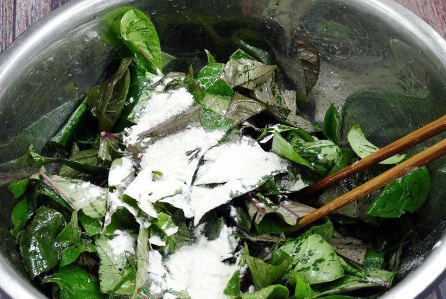 烹饪第二步:准备一个干净的盆,将红薯叶放入其中,然后撒上一些食盐,然后加上一些玉米面粉,撒上一些粗玉米面粉,用手均匀的拌一下,让玉米粉全部包裹住。