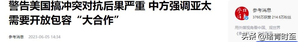 信息来源:参考消息 2023-6-5 《警告美国搞冲突对抗后果严重 中方强调亚太需要开放包容“大合作”》