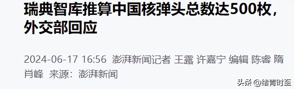 信息来源:澎湃新闻 2024-6-17 《瑞典智库推算中国核弹头总数达500枚,外交部回应》