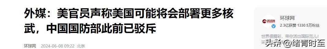 信息来源:环球网 2024-6-8 《外媒:美官员声称美国可能将会部署更多核武,中国国防部此前已驳斥》