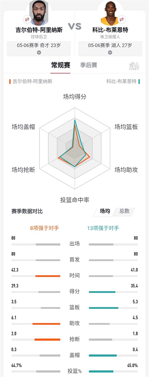 阿里纳斯与科比05—06赛季的数据对比