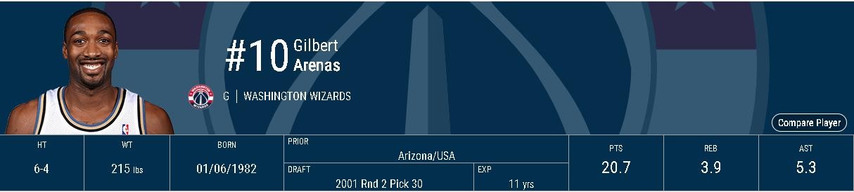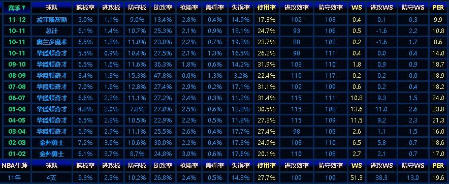 在高阶数据方面,生涯平均使用率为27.7%,最高的是06—07赛季的31.4%,这个赛季他的进攻效率115,生涯次高,整个奇才时期,有四个赛季的使用率超过30%。胜利贡献值方面,巅峰三年分别为11.5、13.6、10.8,PER值也是最高的21.3、23.8、24,此外,再没有高于20的。不过,他的防守只能说是中等水平,其实以他的身高速度和臂长意味着他是有着优秀防守者的底子的,可惜的是,他从来就没有想要把自己的长处用在防守上。总的来说,在巅峰三年里,虽然阿里纳斯并没有带领球队走的很远,但他确实在用实力扛着球队前进。