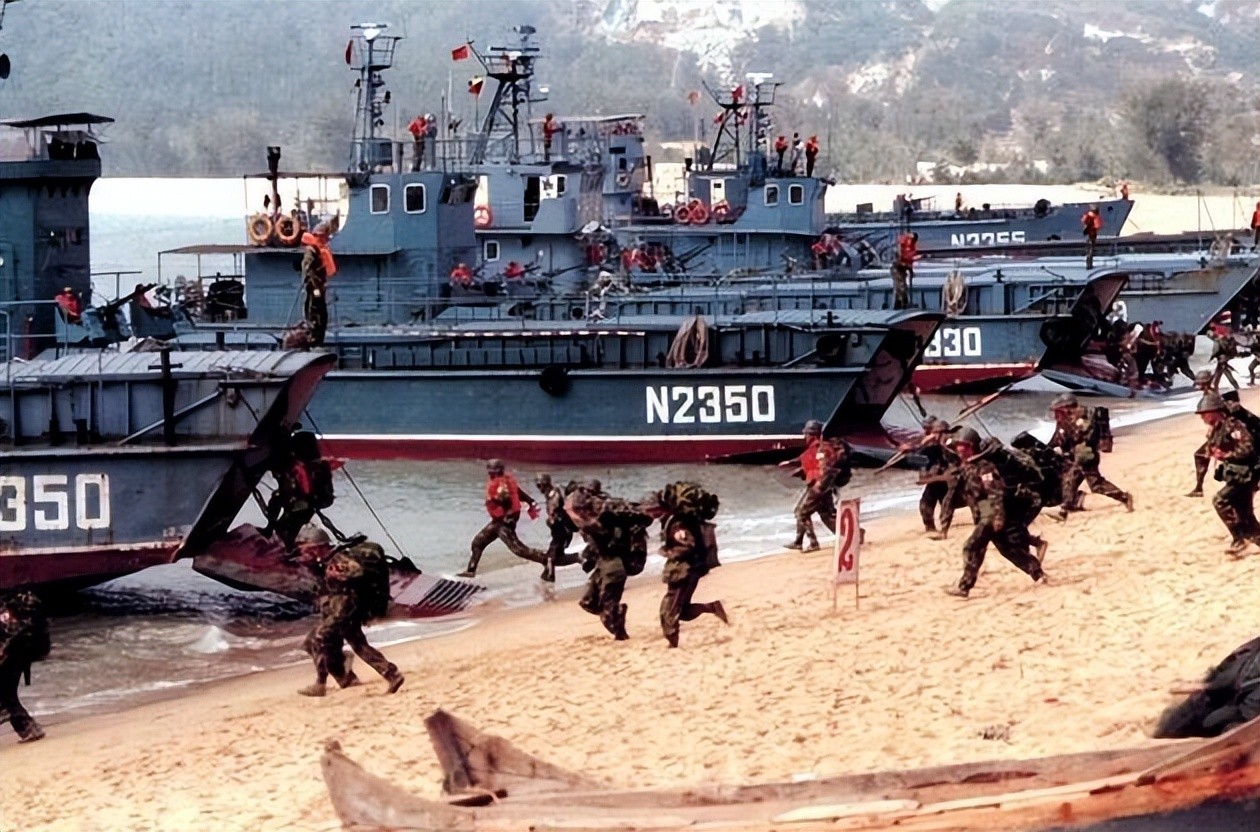 演习中,解放军陆军、海军陆战队、空军、海军协同作战,驱逐舰队掩护运输舰队登陆,火箭炮扫射海滩,两栖坦克和登陆艇载满士兵登陆。