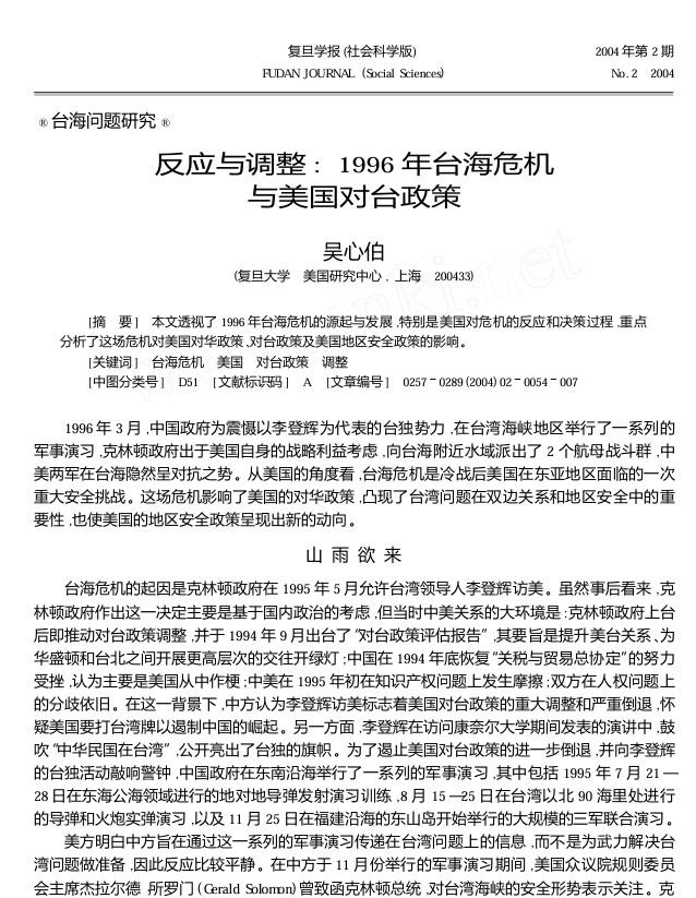 1.《反应与调整:1996年台海危机与美国对台政策》,吴心伯
