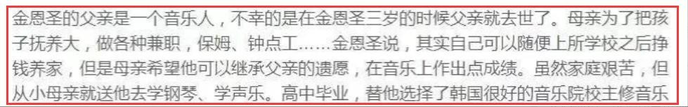 于是妈妈赚着零工的钱,从牙缝里省出来的学费,将高中毕业的金恩圣送进了韩国较好的音乐学院进修音乐。