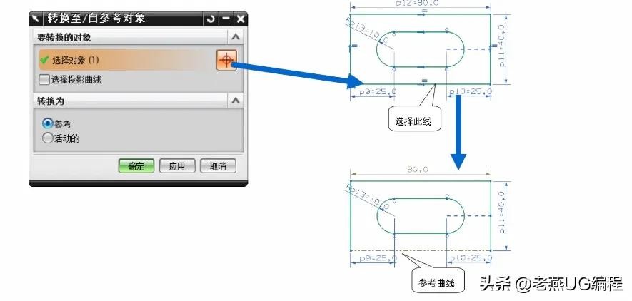 可以将活动曲线转换为参考曲线、将活动尺寸转换为参考尺寸、将参考曲线转换为活动曲线或者将参考尺寸转换为活动尺寸。参考曲线显示为双点划线。