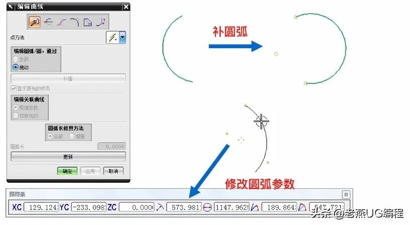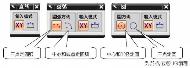 这三个对话框都提供了【输入模式】选项,含义与【配置文件】中相同。而【圆弧】和【圆】对话框还提供了【创建方法】选项,可以选择不同的创建方法和不同的输入模式来创建圆弧或圆。