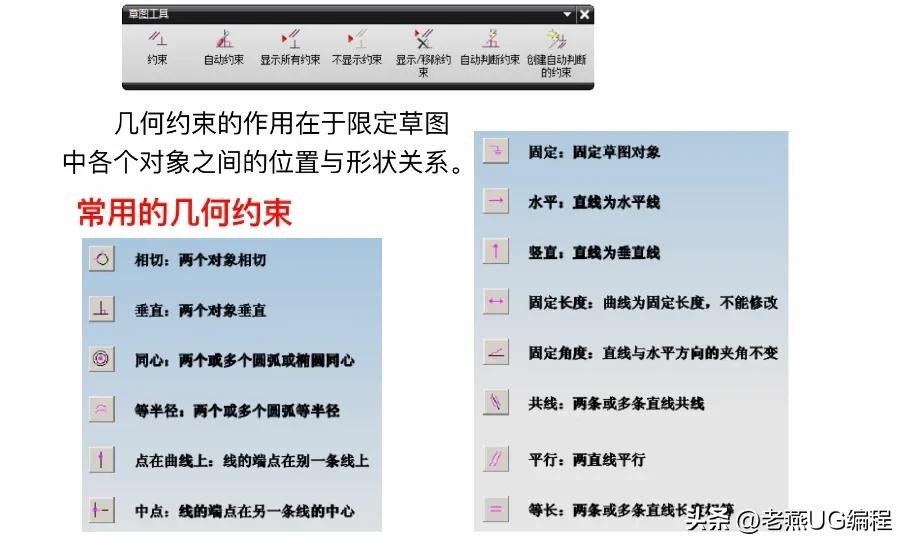 草图约束有两种类型:几何约束和尺寸约束。