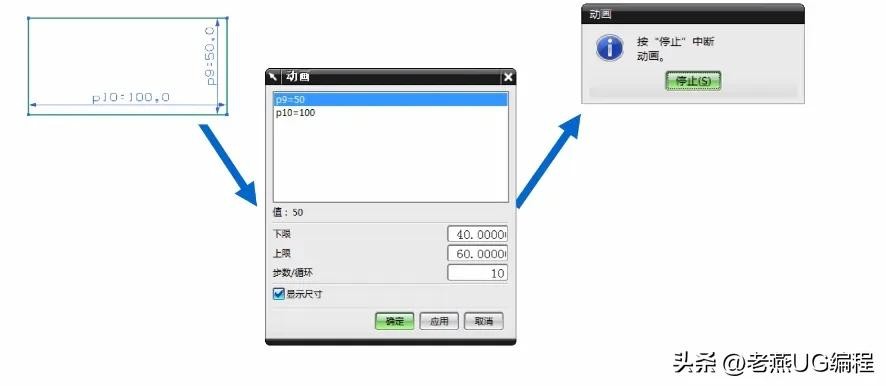能动态显示指定尺寸在给定的范围内发生变化的效果。受这一选定尺寸影响的任一几何体也将同时被动画。与拖曳不同,动画不更改草图尺寸,动画完成之后,草图会恢复到原先的状态。