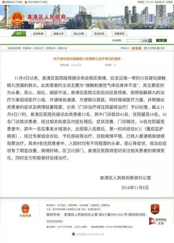 截至8日17时,泉港区医院陆续接诊来自南埔镇、后龙镇沿海一带的52名疑似接触碳九泄漏的群众。此类患者的主诉为“接触刺激性气体后身体不适”,其主要症状为头晕、恶心、呕吐、咽部不适。