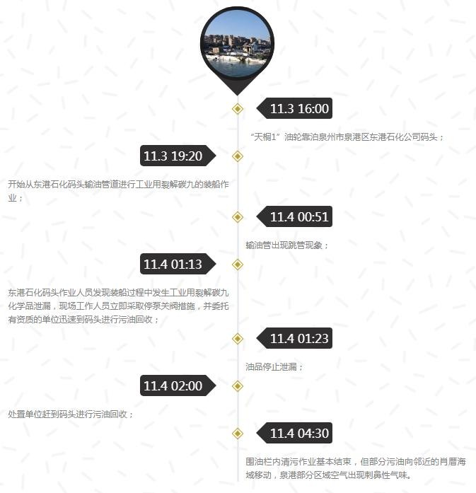 2018年11月4日凌晨,福建省泉州市泉港区的一艘石化产品运输船发生泄漏,6.97吨碳九(又称C9,石油炼制副产品中含有九个碳原子芳烃的聚合物)漏入近海造成水体污染,引起社会震动。