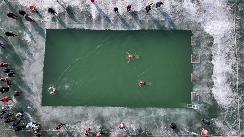 2025年1月1日,游客在观看冬泳表演(无人机照片)。新华社记者 王鹏 摄