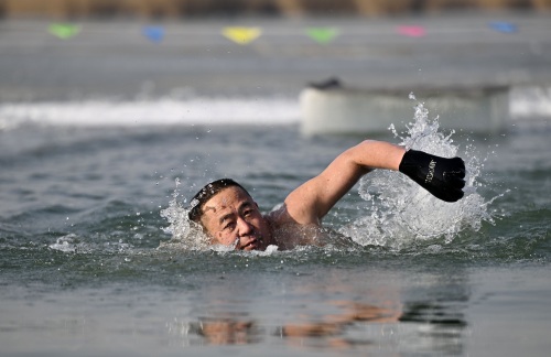 2025年1月1日,冬泳爱好者在现场为游客表演冬泳。新华社记者 王鹏 摄