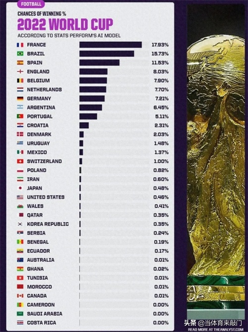 AI预测世界杯夺冠概率,法国第一、巴西第二、阿根廷第八