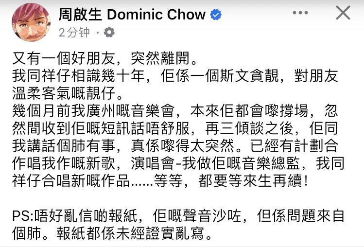 2025 年 3 月 29 日,香港乐坛惊传悲讯——90 年代情歌领域的杰出代表人物李国祥因肺部顽疾猝然辞世,享年 60 岁。其生前挚友、音乐人周启生于社交平台证实此噩耗,并披露数月前李国祥曾以“肺部抱恙”为由取消广州音乐会之行,原定的新歌合作以及演唱会规划终究化作遗恨:“而今唯有来世再续