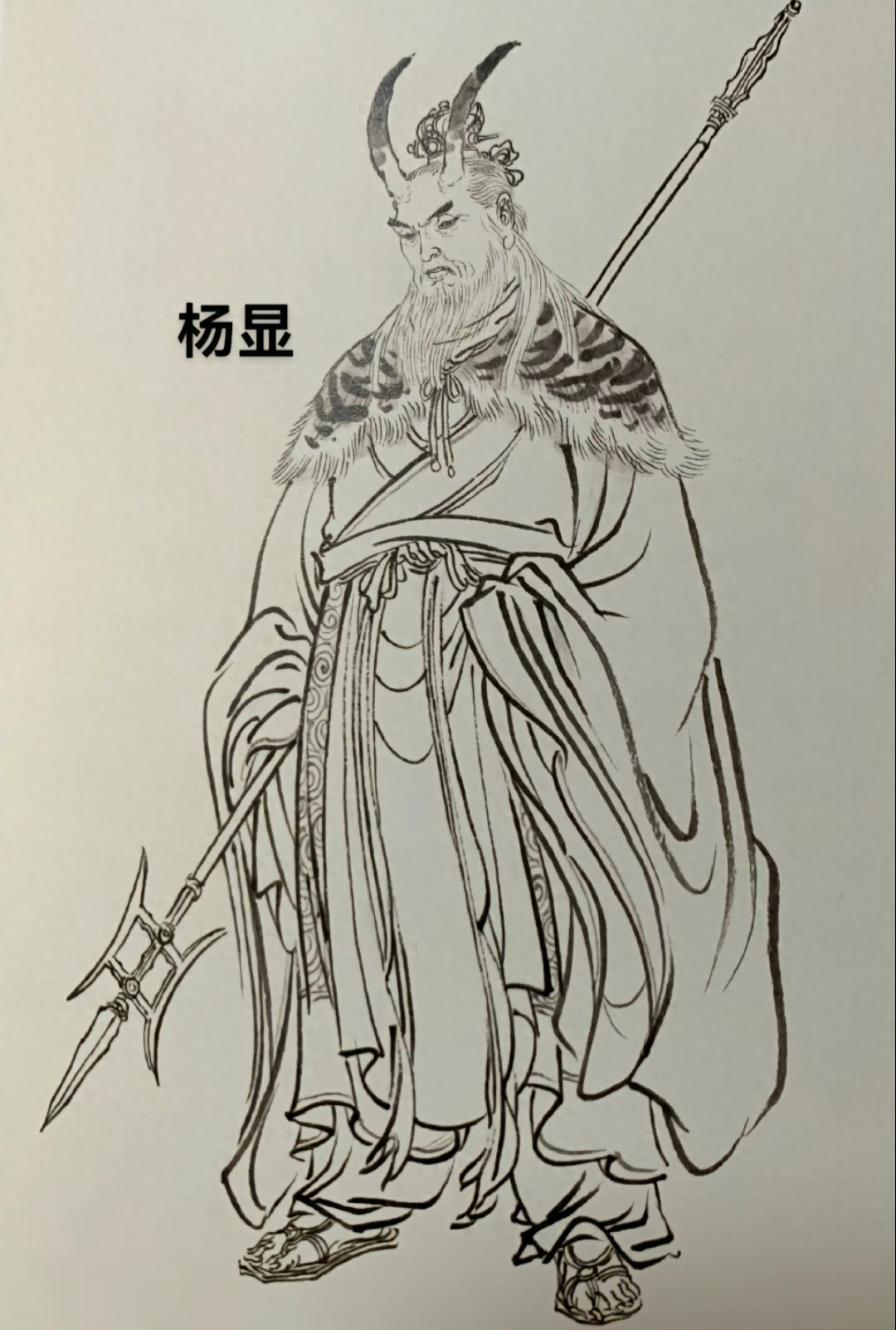 次日,杨显随同袁洪率领大军出战诸侯联军,杨显自告奋勇前去请战,后手持方天画戟冲杀过来,杨戬在旗门下用照妖鉴一照,得知杨显的本体乃是一只山羊后,便手持三尖两刃刀前去迎战。