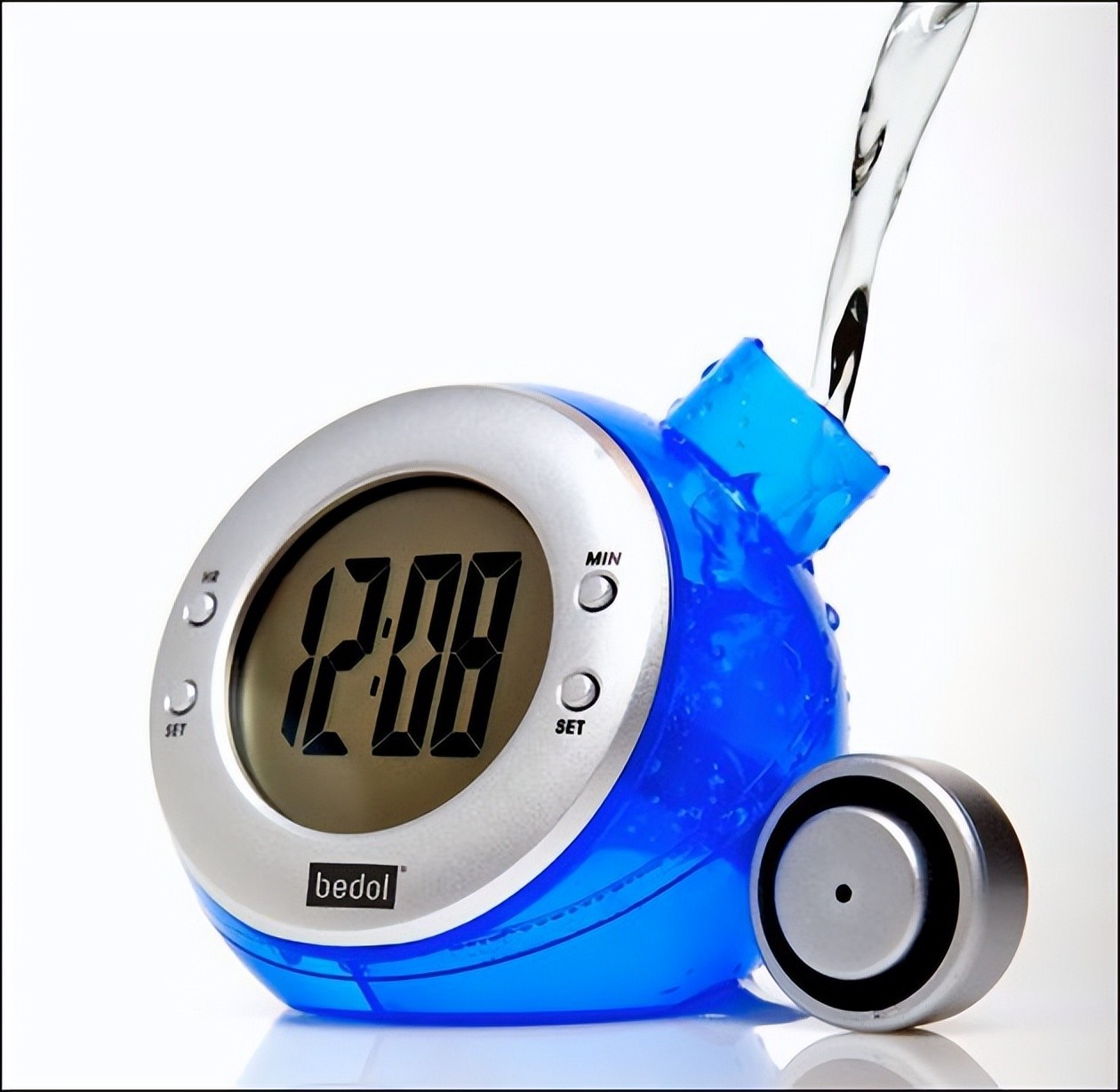 将水装满后可以持续使用长达6个月。当需要换水时,屏幕上的数字会变淡。将水倒掉重新装满就又可以使用了。不仅环保,而且具备了平时使用所需的功能(闹钟等),很实用。