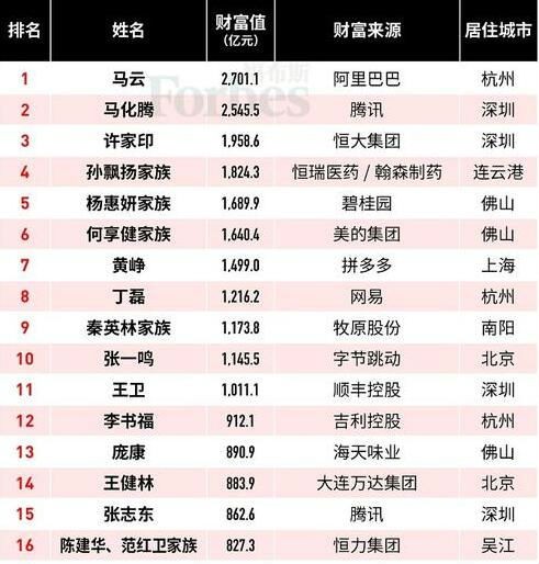 2019中国首富最新十大排名:马云、马化腾、许家印、孙飘扬家族、杨惠妍家族、何享健家族、黄峥、丁磊、秦英林家族、张一鸣。