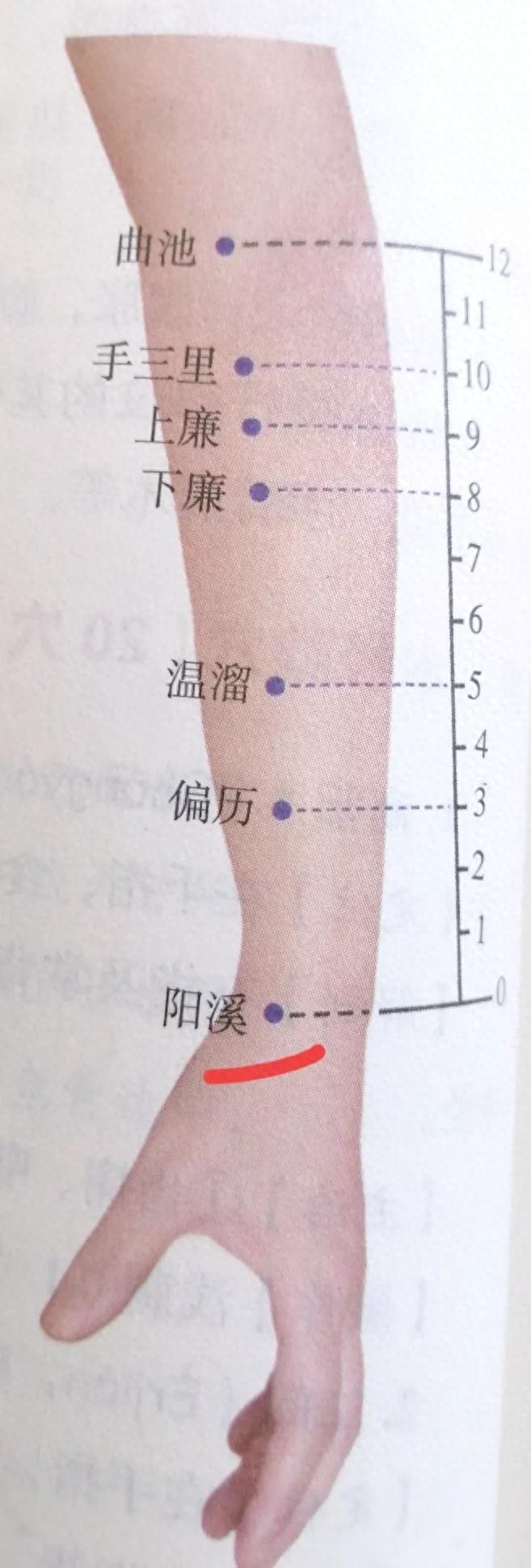 【取穴方法】正坐横肘立掌,由拇指背面向上,腕骨桡侧,取穴时拇指向上翘起,腕横纹前出两条筋,即拇长伸肌腱和拇短伸肌腱,两筋与腕骨、桡骨茎突所形成的凹陷正中即是穴。