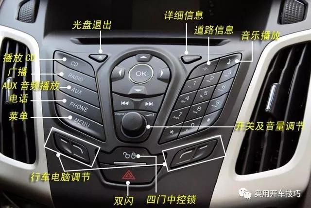图中车型为新福克斯,中控台上的按键也是目前大部分车型常用的,除了右上的TA键,这在国外是道路时时信息播报,但国内没有这方面的硬件支持,只是个摆设了,其他的CD、广播、电话、菜单等都非常容易理解。
