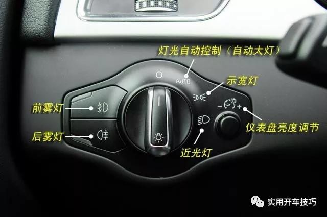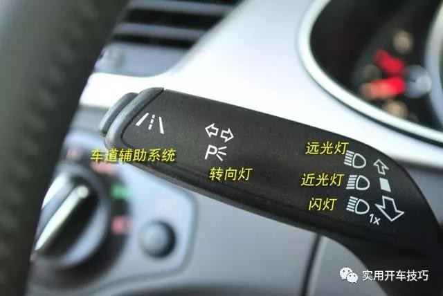 通常,德系和美系车型的汽车灯光控制调节都设置在方向盘的左下方,标识也较好理解,上图是以奥迪车型为例。没有大灯自动调节的车型就会设有手动调节旋钮,而打开近光灯后配合转向灯拨杆前推就可以变换为远光灯,往后拉则远光灯闪一下,也就是俗称的闪灯,许多车主在会车时常常用到。