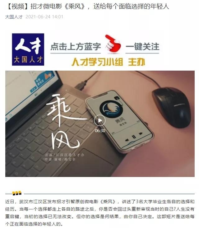 6月18日,在毕业季来临之际,江汉区招才原创微电影《乘风》首发,献给迈向未来的年轻人。