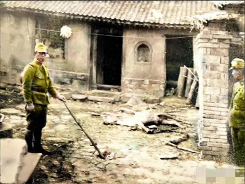 照片的画面定格在一个简陋而宁静的农家小院中,画面中,两位日本士兵的身影显得格外突兀,他们的面容中透露出几分迷茫与不安。其中一位士兵,手中紧握着一根木棍,手指颤抖地指向地面上一个触目惊心的弹坑,那里,曾是日军侵华将领阿部规秀生命终结的地方。不远处,一头无辜的驴子静静地躺在血泊之中,当时阿部规秀的尸体已经被运走了,那头驴还躺在院子里。