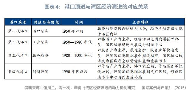 从产业视角看,“湾区经济”从出现到成型的发展逻辑相似,演进过程可以划分为典型的四个阶段(伍凤兰等,2015):港口经济阶段(20世纪50年代以前)、工业经济阶段(20世纪50年代至80年代)、服务经济阶段(20世纪80年代至90年代)和创新经济阶段(20世纪90年代以后)。