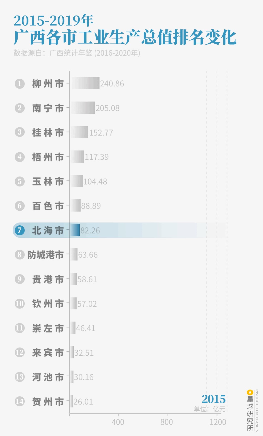 2015-2019年广西各市工业生产总值排名变化 | 制图@陈随/星球研究所