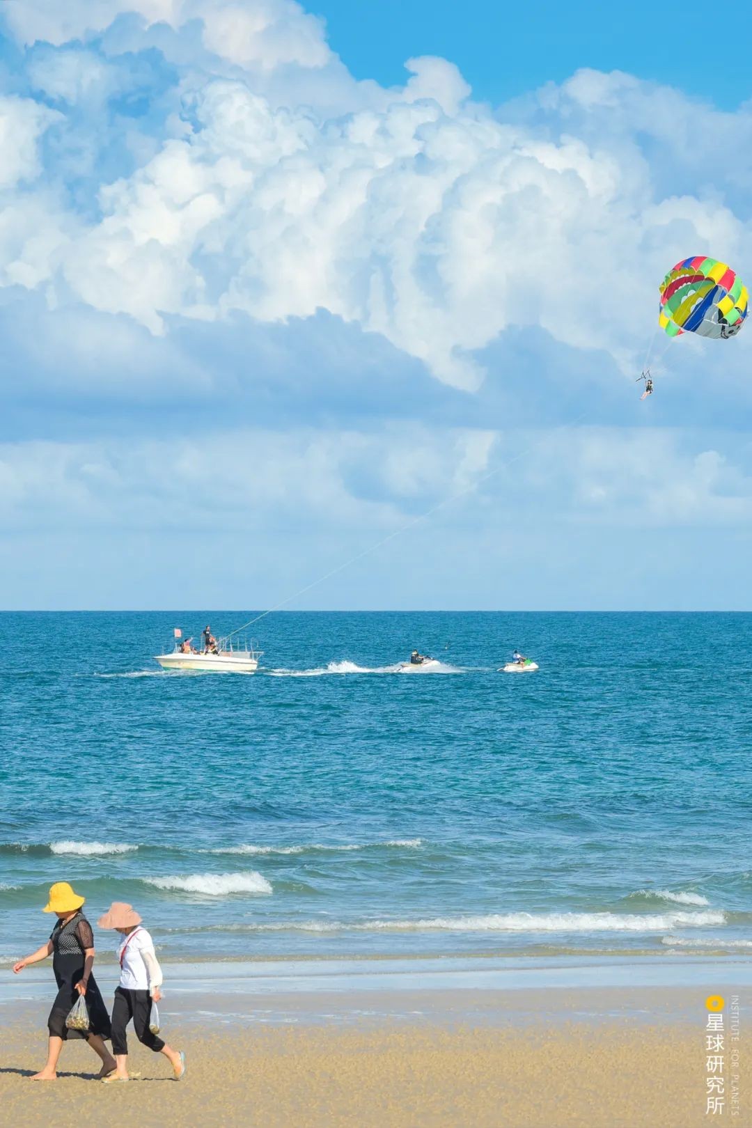 在海上,水上摩托、海上滑翔伞成为游人的娱乐天堂,欢快的氛围弥漫在碧海之上。渔民则带着渔网,满怀期待,掌舵航行,渔网一落一起,收获满满喜悦。