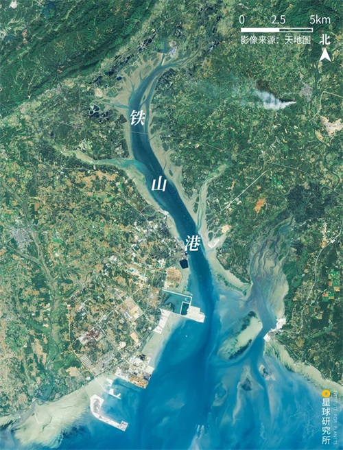 铁山港,包括主河流公馆河在内汇入该海湾的小型河流众多,故分叉较多,似一鹿角 | 影像来源@天地图;标注@陈随/星球研究所