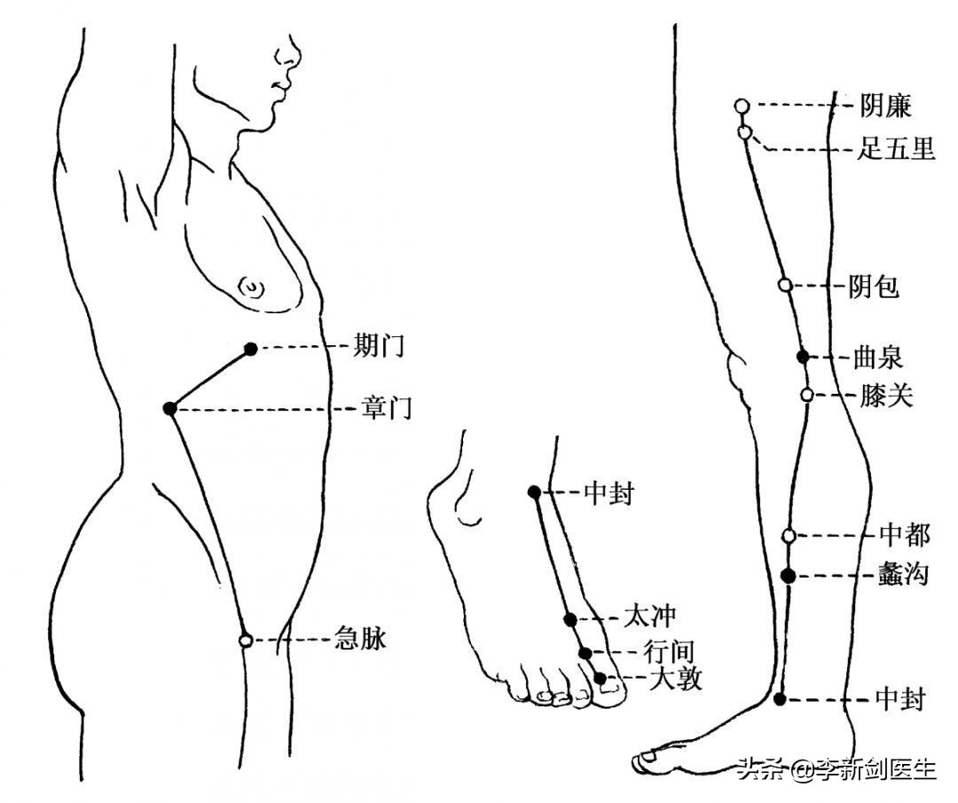 足厥阴经入阴毛, 绕阴器, 抵少腹, 其络循经上睾, 结于茎; 其经筋亦沿胫上结于阴器, 络诸筋。