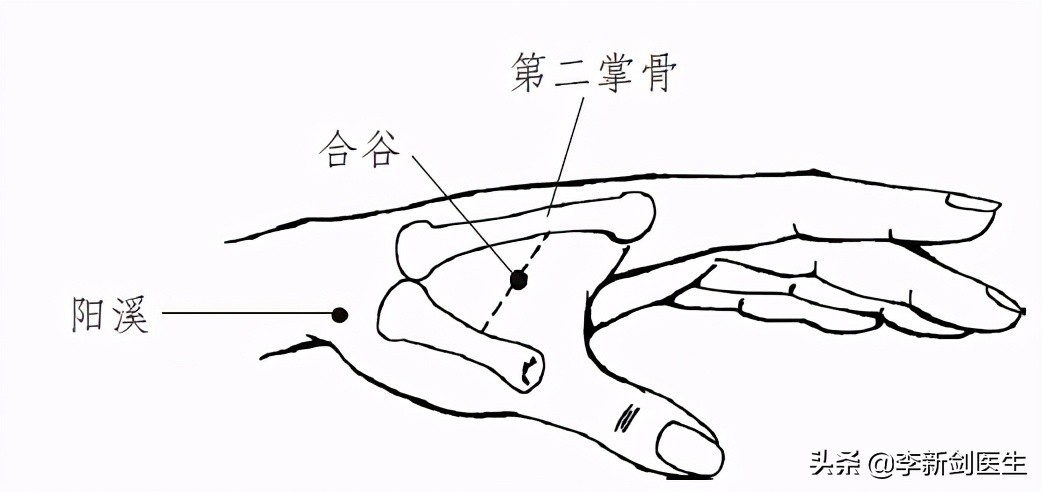 合谷穴,又名“虎口”、“合谷”,首载于《灵枢·本输》,日:“合谷,在大指岐骨之间,为原”。因食指和拇指二指并拢后,当虎口处有一隆起的肌肉,形如突起的山峰,故取其意,形意相结为合,故取名为合谷。合谷穴是手阳明大肠经的原穴,位于手背部第一、二掌骨间,第二掌骨桡侧的中点处。