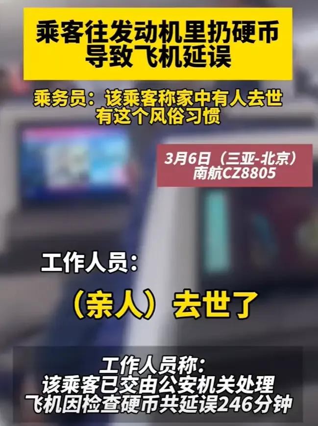 昨日,一架从某地飞往他处的航班上发生了一桩令人匪夷所思的事件,一位乘客竟然冒险往飞机发动机投掷硬币,并且还敢隐瞒真正的数量!这个闹剧般的行为让所有乘客都大吃一惊。
