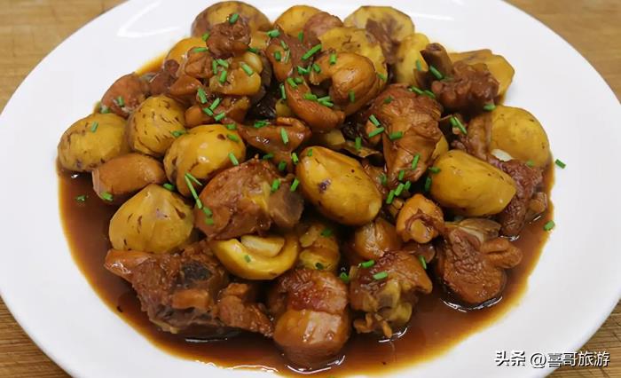 板栗烧鸡,是景德镇的一道传统名菜,是深受当地人喜爱的一道地道佳肴,也是色香味俱全的美食。在当地种植有特别多的栗子树,每一盘栗子鸡的栗子都是现摘出来的,因此烹饪出来的会有一种鲜美的口感,里面还有加入红辣椒、大蒜等配料。其成品棕红油亮、咸香中带着微辣,美味可口。