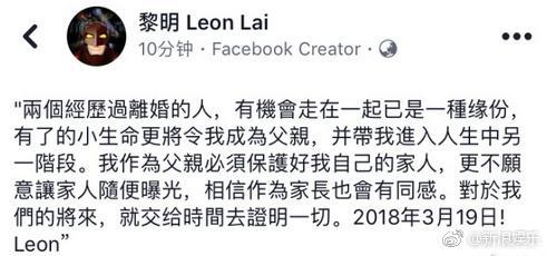 3月19日下午,黎明在社交媒体宣布当爸喜讯,他说“两个经历过离婚的人,有机会走在一起已是一种缘分,有了的小生命更将令我成为父亲,并带我进入人生中另一阶段。我作为父亲必须保护好我自己的家人,更不愿意让家人随便曝光,相信作为家长也会有同感。对于我们的将来,就交给时间去证明一切。2025年3月19日!Leon”。