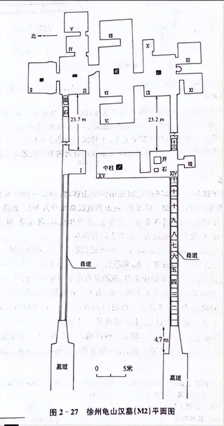 龟山汉墓由两座并列相通的夫妻合葬墓组成,其中南侧为楚王襄王刘注墓,北侧是楚王夫人墓,每条通道长56米,高1.78米,宽1.06米,沿中线开凿最大偏差仅为5毫米,精度达到1/10000,南北通道相距19米,夹角为20秒,误差是1/16000 ,通道地平面,内外高低相差527毫米,呈10/1000的自然坡度,是到目前为止世界上开凿精度最高的通道。