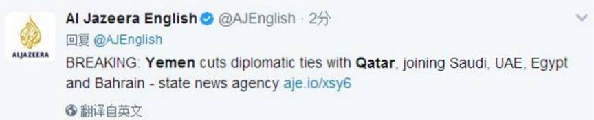 半岛电视台6月5日援引也门国家通讯社消息称,也门当日也宣布与卡塔尔断绝外交关系,并支持停止卡塔尔参加在也门的联军活动。