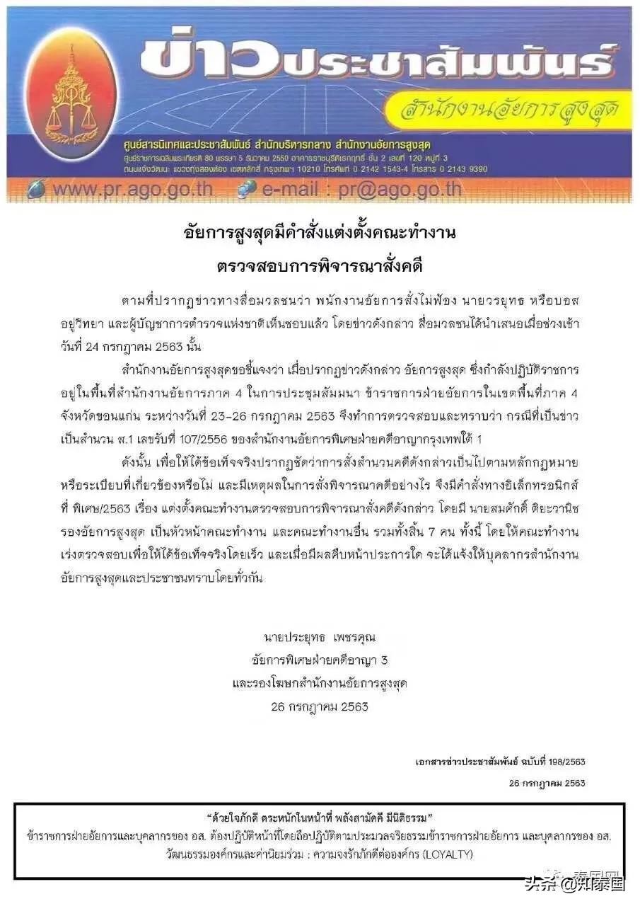 7月26日,泰国总检察长办公室发布通知,称已设立调查小组彻查沃拉育一案,如案件有新进展调查小组将及时上报总检察长办公室并向民众公示。