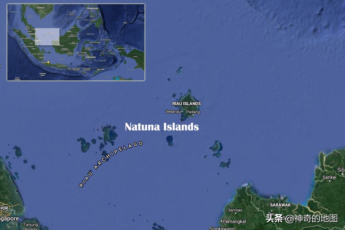 纳土纳群岛(Natuna Islands)位于南海几乎最南边,夹在马来半岛和加里曼丹岛中间稍北海域。整个群岛由纳土纳大岛(Natuna Besar)、南纳土纳群岛(South Natuna archipelago)、淡美兰群岛(Tambelanarchipelago)和巴达斯群岛(Badas Islands)等272个大大小小的岛屿组成,总面积2110平方公里(相当于2个香港大小),人口约9万(也就是一个大点的乡镇的人口)。现在纳土纳由印尼控制,而印尼也因此成为了对南海资源的声索国之一。