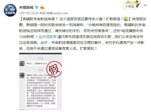 @央视新闻 谨代表本频道很负责任地告诉大家,我们从来没有发布过这条消息。此外,宇宙射线增强是司空见惯的事件,会对手机通信产生一点影响,但绝不会通过通信设备危害人体。扩散周知!