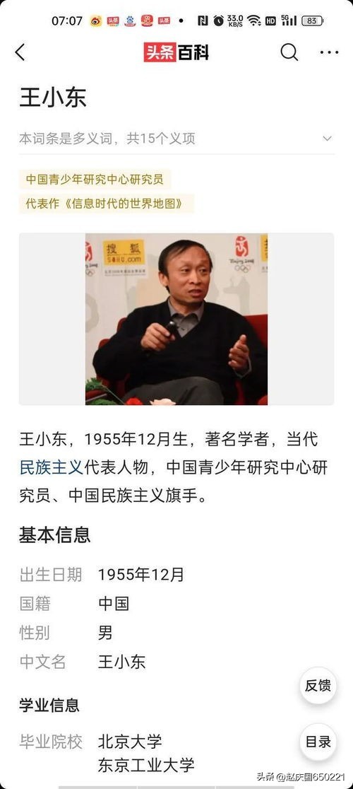 王小东,1955年12月生,北京大学毕业,后求学于日本东京工业大学,著名学者,当代民族主义代表人物,中国青少年研究中心研究员、中国民族主义旗手。是一度畅销书《中国不高兴》的主创作者之一。现退休在家发挥余热,做起了个人自媒体,拥有数百万粉丝的时事评论大V,自称担任某协会主席。他性格率真,对国内国际评说从不掩饰隐晦观点,咄咄逼人的气势充斥着真理的化身,可能和基于他说的人脉广泛、信息来源广博有关。