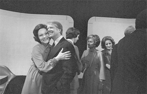 1976年10月22日,美国威廉斯堡,民主党总统候选人吉米·卡特在第三次总统辩论后与妻子罗莎琳拥抱(视觉中国/图)