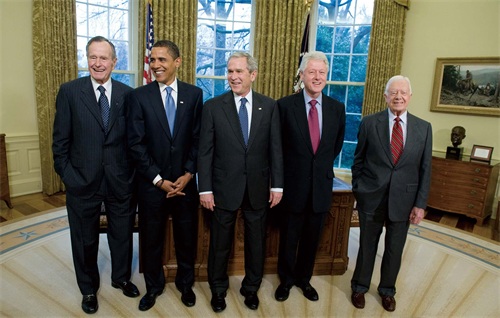2009年1月7日,华盛顿特区,白宫椭圆形办公室,时任美国总统乔治·W·布什(中)与当选总统巴拉克·奥巴马(左二)、前总统乔治·H·W·布什(左一)、前总统比尔·克林顿(右二)和前总统吉米·卡特(右一)合影(视觉中国/图)