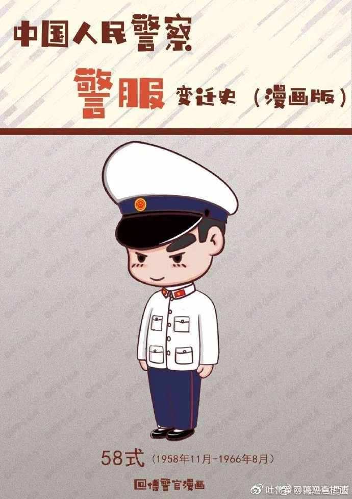 1958年11月1日,民警服装施行新的制式,即“五八式”警服。“五八式”警服,是对“五五式”警服的修改补充,1958年设计定型,1959年10月1日陆续更换。