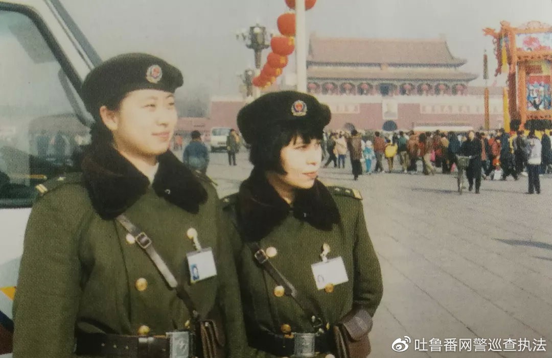 北京第一代女巡警在天安门广场执勤。