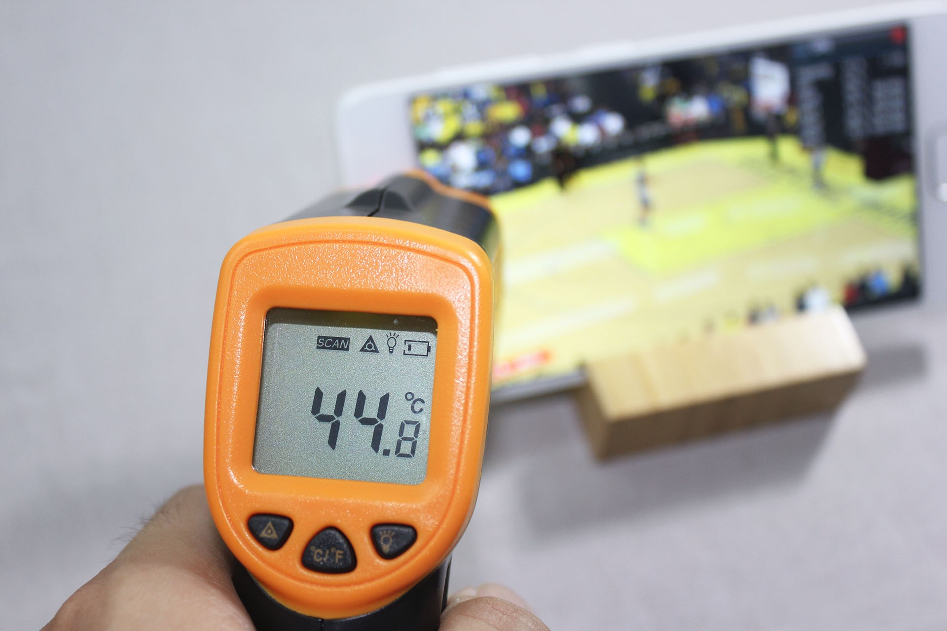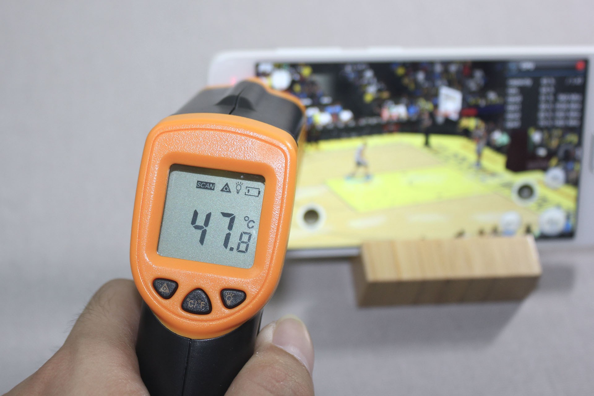 在一间没窗没空调和风扇的房间里,室温34度。运行NBA 2K1几分钟后,最大发热区域为手机正面右上角附近,我测试为45度左右。