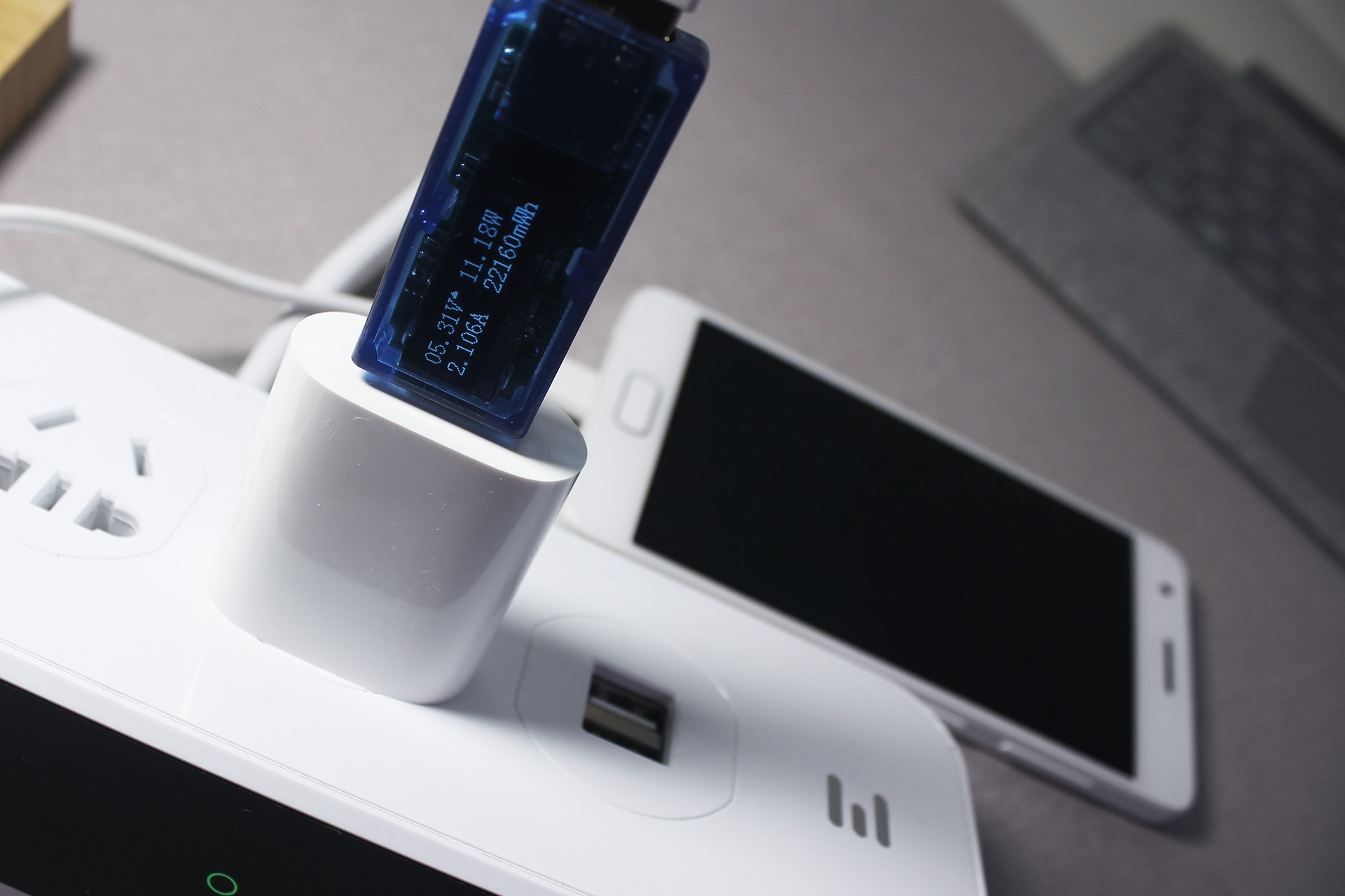 实测熄屏下,输出电压5.3V,电流2.1A,平均功率在11W多。离真正的快充还有距离,即便用寻常5V/2A的充电头替代充电也不会慢多少。