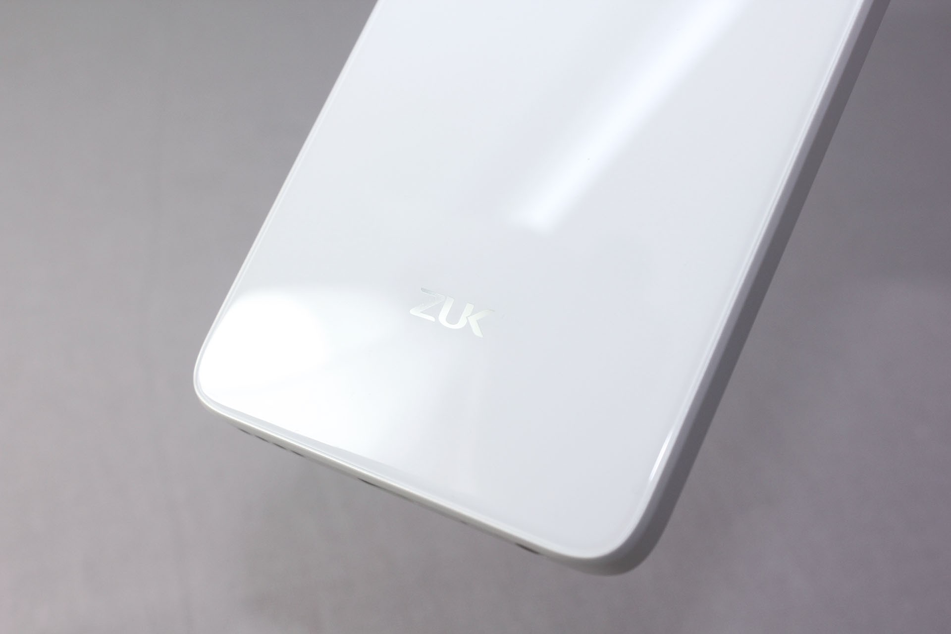 背面仅在底下有ZUK的LOGO,除此之外无任何多余信息,算是最简洁的后盖设计,并且值得一提的是背面同样采用2.5D玻璃,虽然同样弧度不大,但就是这正反双面的2.5D玻璃为厚重的Z2增加了一丝圆润精致感。不过打磨过于光滑导致放置在桌上有一丝不平都会自己滑动(可以看我前面视频部分),但由于中框的直线过度和材质原因,握持起来反倒比我曾经用过手感较为不错的pro6要趁手,pro6不戴套单手操作时候很容易滑落。